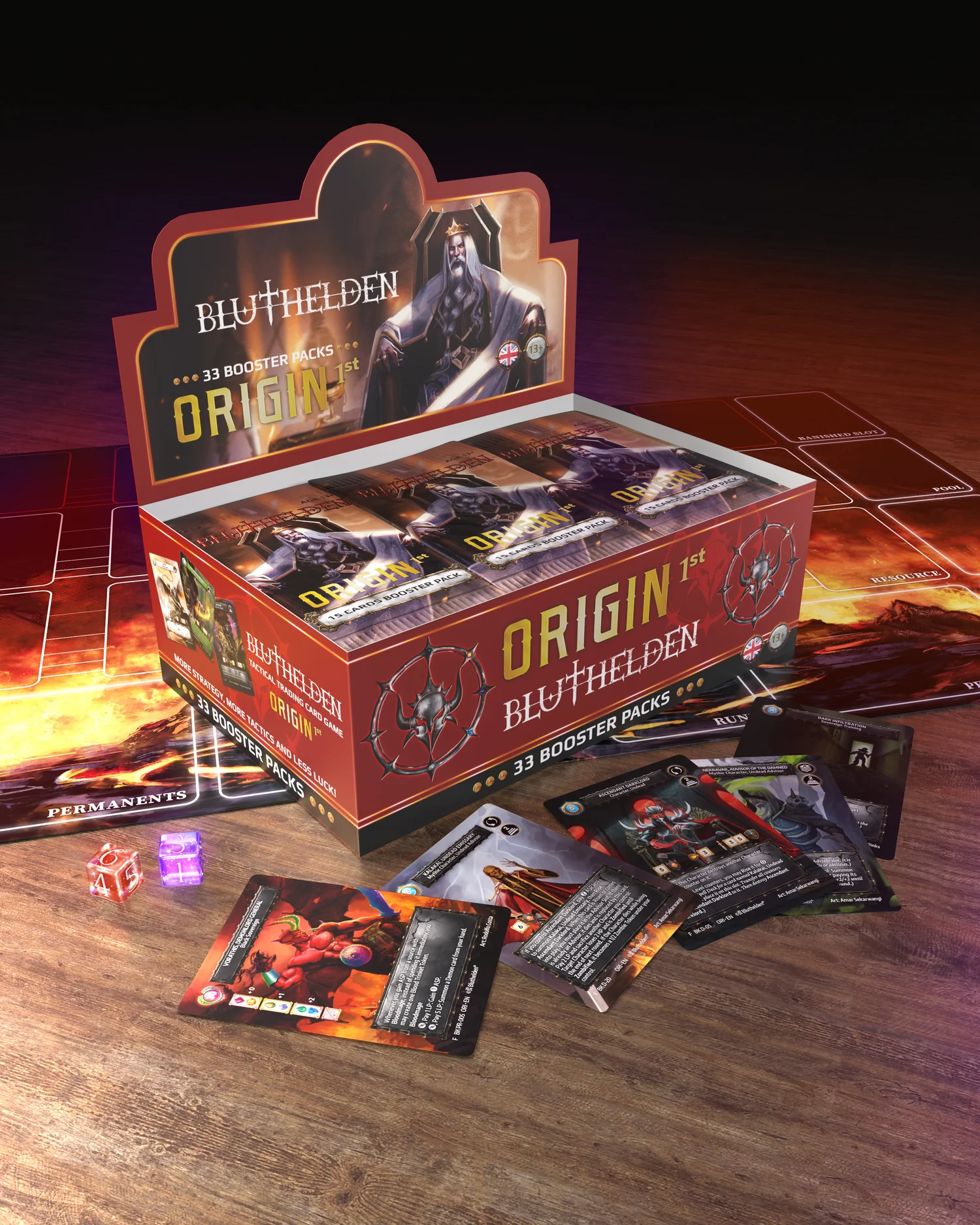 Bluthelden Origin Display ist die erste Edition des in Deutschland entwickelten Tactical Trading Card Games Bluthelden und markiert den Beginn einer neuen Ära strategischer Sammelkartenspiele. Die Edition erscheint auf Englisch und umfasst 250 verschiedene Karten, die die ersten vier Herrscher und Farben von insgesamt acht einführen. Origin bietet nicht nur intensive taktische Tiefe und strategische Vielfalt für Spieler, sondern auch echten Nervenkitzel für Sammler. Besonders beeindruckend sind die 1000 einzigartigen, nummerierten 1/1-Karten sowie 75 exklusive Varianten, die jeweils in zehn unterschiedlichen Design-Details erscheinen – jede einzelne davon ein weltweites Unikat. Mit seiner Kombination aus taktischem Anspruch, kunstvoller Gestaltung und limitierter Sammelbarkeit ist das Bluthelden Origin Display ein Highlight für alle, die auf der Suche nach einem außergewöhnlichen neuen TCG-Erlebnis sind.