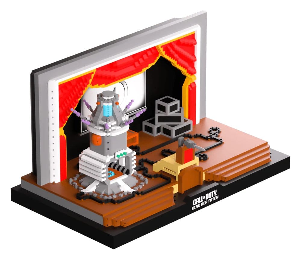 Es ist Showtime! Sind Sie bereit, sich Welle für Welle von Zombies zu stellen, Stein für Stein, mit diesem meisterhaft gefertigten Bausatz von Kino Der Toten aus Call of Duty! Mit einem schweren rot-gelben Vorhang, der zurückgezogen ist, um eine Projektionsleinwand und eine Mystery-Box mit einem kleinen Teddybär darauf zu enthüllen, während schwere Kisten achtlos zur Seite liegen, ruht ein montiertes Maschinengewehr auf dem Podium an der Vorderseite der braunen Bühne, während schwarze Drähte über seine Oberfläche zum hoch aufragenden grauen Materietransfergerät laufen, das weiße Grate und orangefarbene Kugeln an der Seite sowie blassviolette Stäbe hat, die den durchsichtigen blauen Kern an der Spitze umgeben. Bestehend aus 3479 Teilen und mit den Maßen 20 x 34 x 20 cm, mit einer fachmännisch geschriebenen Anleitung, die Ihnen hilft, Ihr eigenes Stück Call of Duty zu bauen, ist dieser Bausatz die perfekte Kulisse für Ihre Call of Duty Youtooz oder jeden anderen, der jede Welle überlebt hat!