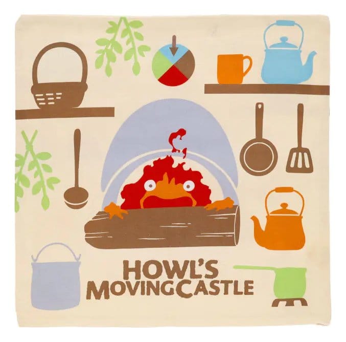 Ein hochwertiger Kissenbezug von Marushin, offiziell lizenziert von Studio Ghibli. Er zeigt die Figur Calcifer aus Das wandelnde Schloss im ‚Natsu Cook with Calcifer‘-Design.