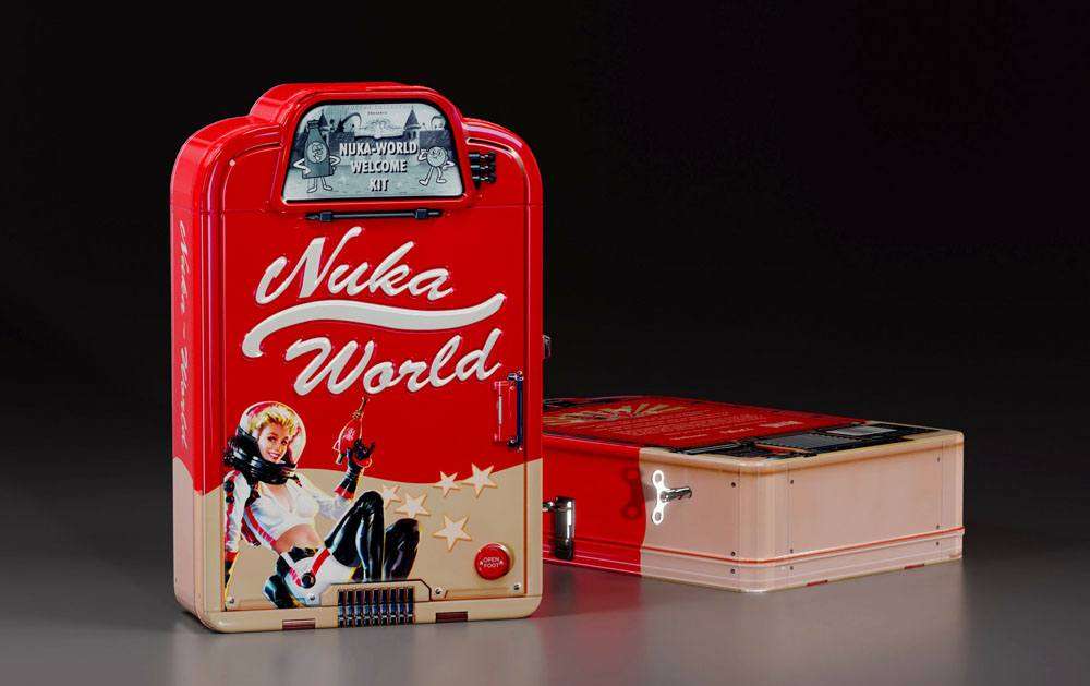 Du wolltest schon immer mal Nuka-World einen Besuch abstatten? Das wird zwar ein bisschen schwierig, aber dieses Willkommenspaket tröstet Dich vielleicht darüber hinweg. Die Box im Nuka-Cola-Automaten-Design kommt mit einem animierten Bildschirm und einer Spieluhr, die das Nuka-World-Lied spielt.