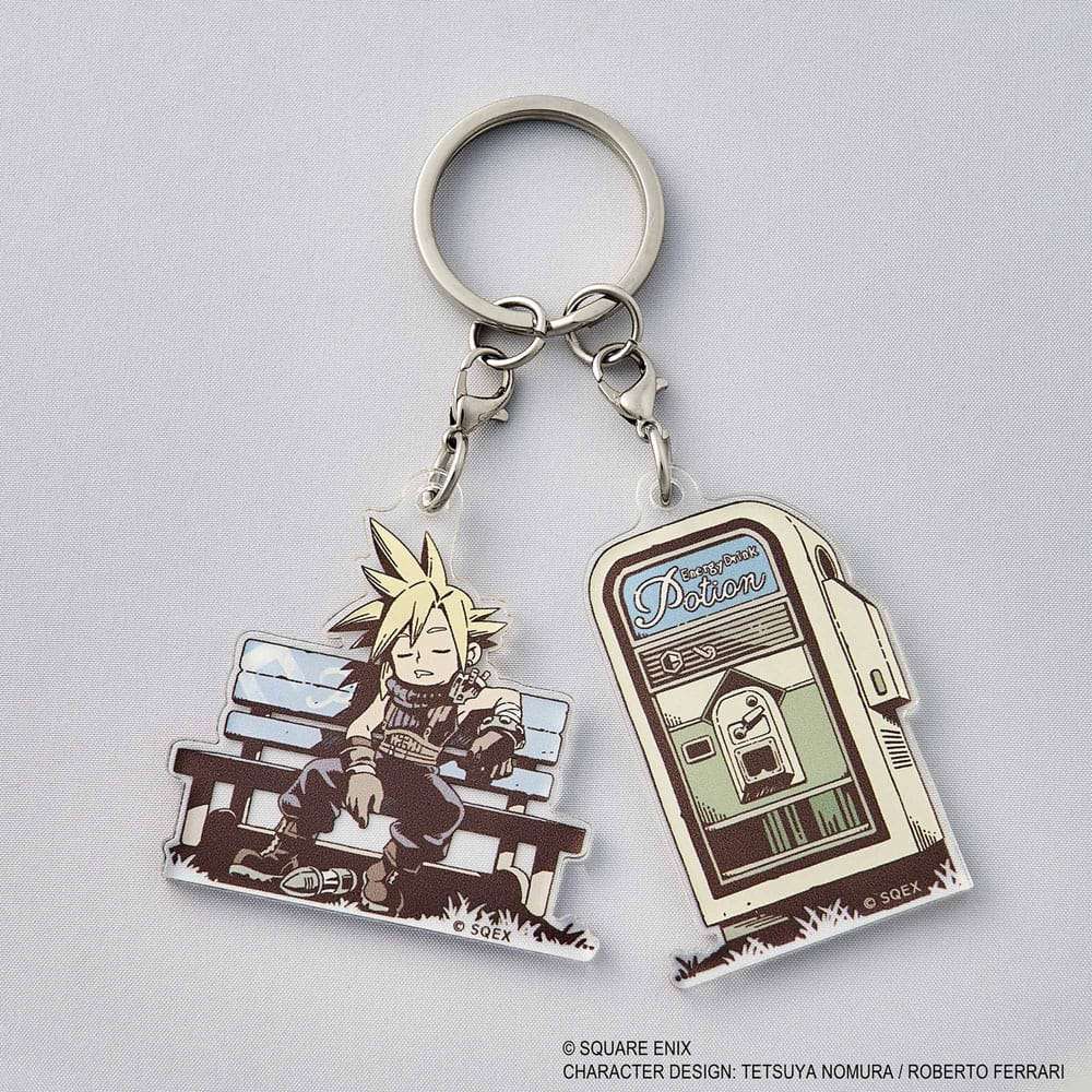 Der Acryl-Schlüsselanhänger zeigt Cloud, der zwischen Kämpfen eine verdiente Pause einlegt, und erscheint zusammen mit einem Automaten für schnelle Erholung!