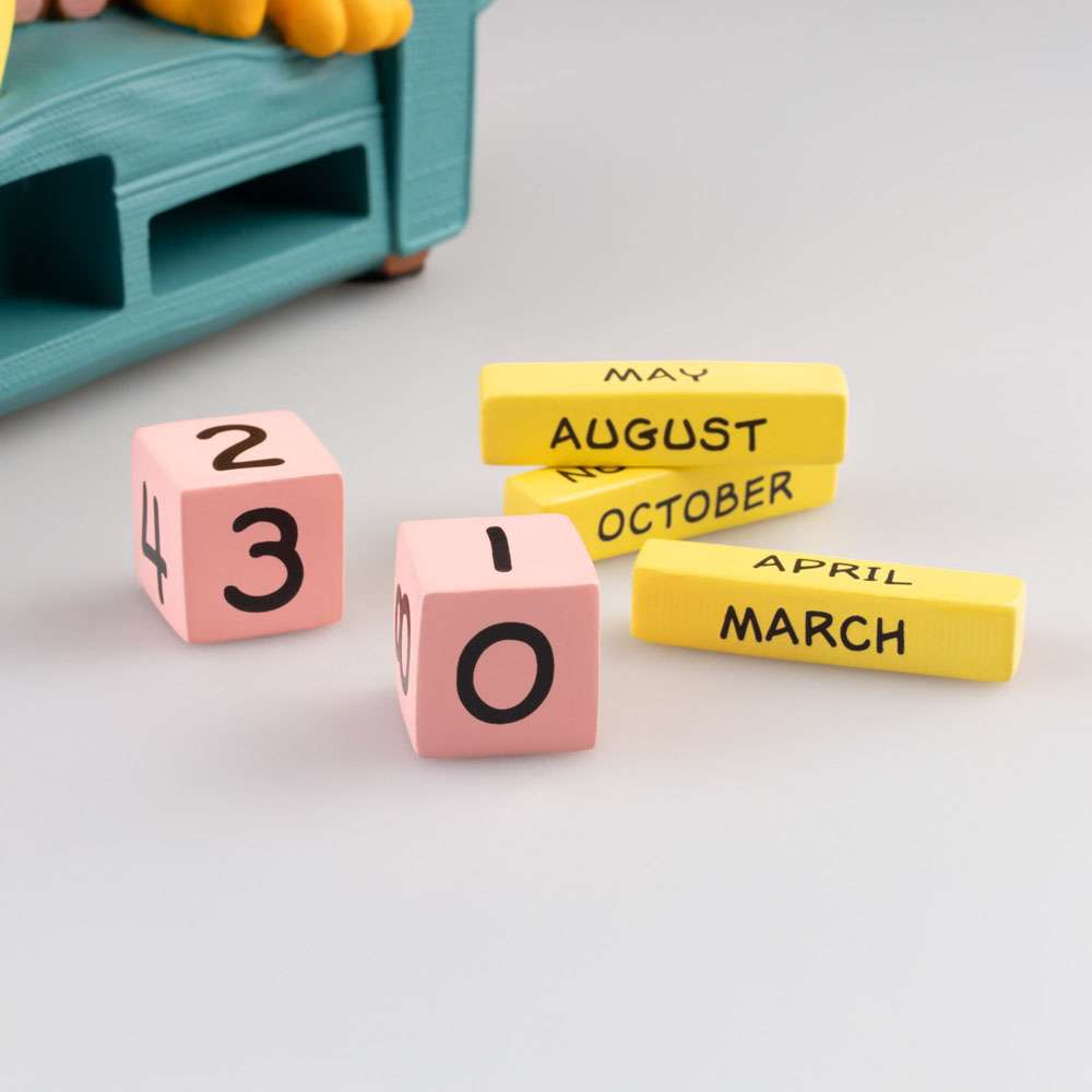 Der Kalender besteht aus 5 Blöcken mit Tagen und Monaten, die ausgetauscht und kombiniert werden können, um alle möglichen Daten zu erstellen.