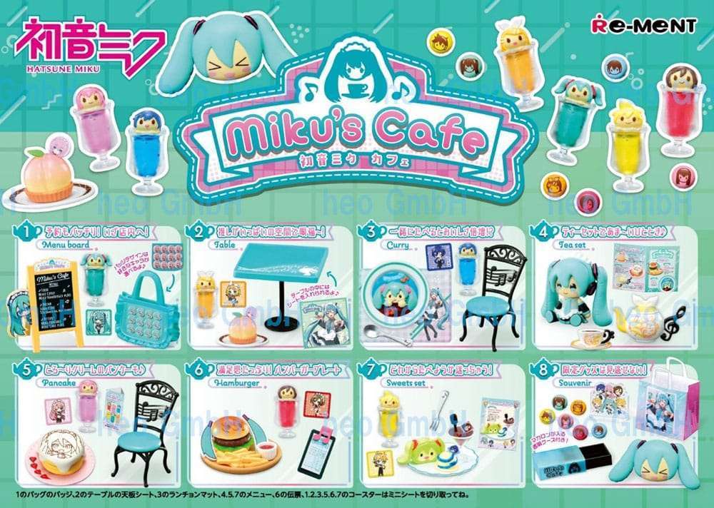 Display mit 8 Blind Boxen mit jeweils mehreren Zubehörteilen für ein Hatsune Miku Cafe.