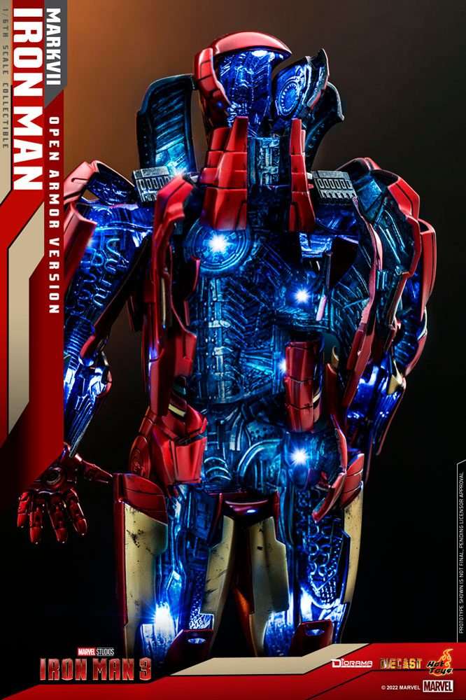 Diese großartige Diorama zeigt den hinten offenen Mark VII Anzug aus dem Marvel Blockbuster ´Iron Man 3´ im Maßstab 1:6. Es ist ca. 32 cm groß, vefügt über Licht-Effekte und wird mit Base geliefert.