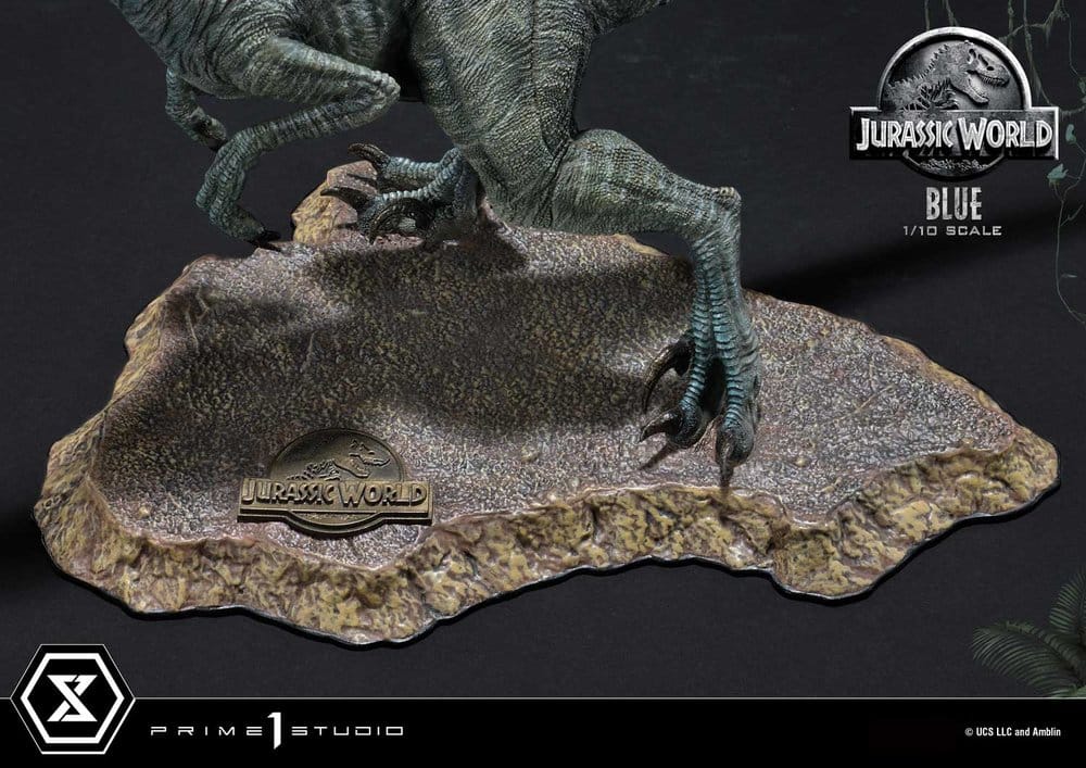 Blue steht auf einem strukturierten Sockel aus Erde, der mit dem Logo von Jurassic World verziert ist, damit du immer daran denkst, woher Blue entkommen ist!