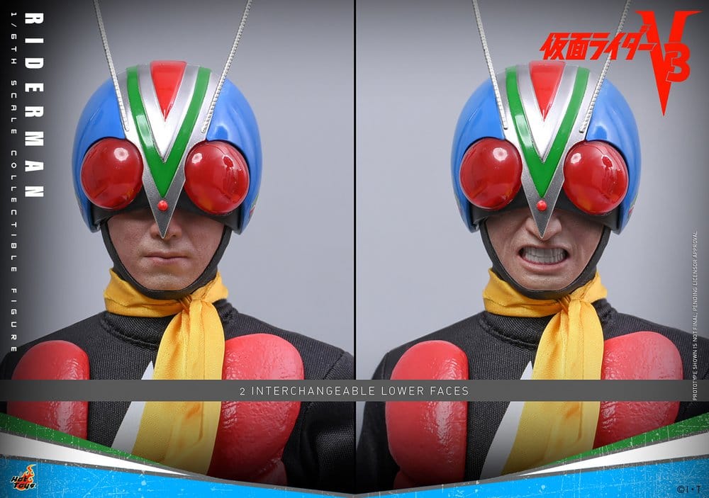 „Lebewohl, V3! Ich überlasse den Rest dir!“ – Riderman. Als ehemaliger Elite-Wissenschaftler der bösen Organisation Destron wurde Joji Yuki verraten und verlor seinen rechten Arm, nur um ihn durch eine kybernetische Prothese zu ersetzen und den Mantel des Riderman anzunehmen! Anfangs ein von Rache getriebener Rivale, bekannt als „Der rächende Dämon“, kämpfte er schließlich an der Seite von Kamen Rider V3 als Held der Gerechtigkeit und verdiente sich zu Recht den legendären Titel „Kamen Rider 4“. Mit seinem ikonischen, halb entblößten Gesicht und den vielseitigen „Kassettenarmen“ bleibt Riderman einer der einzigartigsten Helden der Showa-Ära. Sideshow und Hot Toys freuen sich, die Kamen Rider-Kollektion zu erweitern und die Riderman Sixth Scale Collectible Figure vorzustellen! Meisterhaft gefertigt nach dem Vorbild von Riderman in der TV-Serie Kamen Rider V3, verfügt diese Actionfigur über einen neu entwickelten behelmten Kopf mit einer authentischen Ähnlichkeit von Takehisa Yamaguchi als Joji Yuki. Der detaillierte Helm verfügt über eine magnetisch aktivierte LED-Leuchtfunktion in den Augen und wird mit zwei austauschbaren unteren Gesichtern geliefert, um seine verschiedenen Ausdrücke einzufangen. Ridermans Kostüm besteht aus einem schwarzen Schutzanzug mit grün-weißen Streifen, gepaart mit einer roten Brustpanzerung und silberfarbenen Ärmeln und Stiefeln aus weichem Vinylmaterial. Ein drahtgebundener gelber Schal ist ebenfalls enthalten, um dramatische, vom Wind verwehte Posen zu ermöglichen. Riderman wäre nicht komplett ohne seine charakteristischen Waffen, die drei Sätze austauschbarer Kassettenarme umfassen: den verheerenden Power Arm, den Drill Arm und den äußerst vielseitigen Rope Arm. Der Rope Arm enthält ein drahtgebundenes Verlängerungsseil und mehrere Aufsätze (Haken, Sichel und Keulen), die es den Fans ermöglichen, seine Kampfmodi Hook Arm, Sickle Arm und Swing Arm nahtlos nachzubilden! Um das Ausstellungspotenzial weiter zu erhöhen, wird die Figur auch mit verschiedenen austauschbaren Händen geliefert, einschließlich einer speziellen Händedruckgeste, um seine ikonische Verbindung mit der 1/6-Skala Kamen Rider V3 Collectible Figure nachzubilden. Vervollständigen Sie Ihre Showa Rider-Ausstellung und ehren Sie das Erbe von Joji Yuki, indem Sie diese 1/6-Skala Riderman-Figur noch heute Ihrer Sammlung hinzufügen!