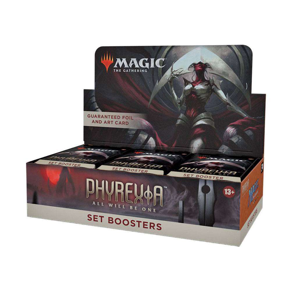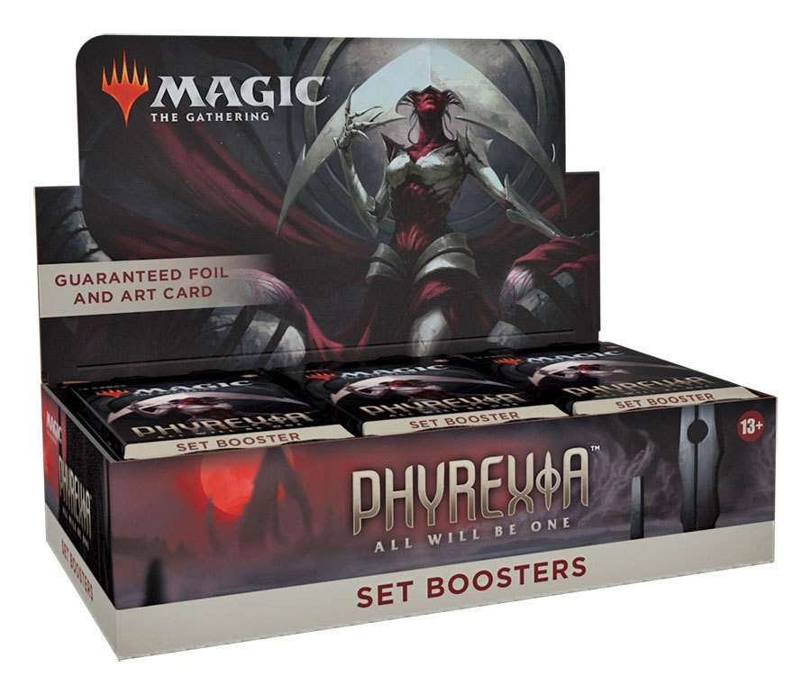 Ein Phyrexia: Alles wird eins Set-Booster-Display enthält 30 Phyrexia: Alles wird eins Set-Booster. Jeder Set-Booster enthält 12 Magic-Karten, 1 Artwork-Karte und 1 Spielstein-/Werbekarte oder Karte aus „der Liste“ (eine besondere Karte aus der Geschichte von Magic oder eine Universes Within Karte – in 25 % der Booster).