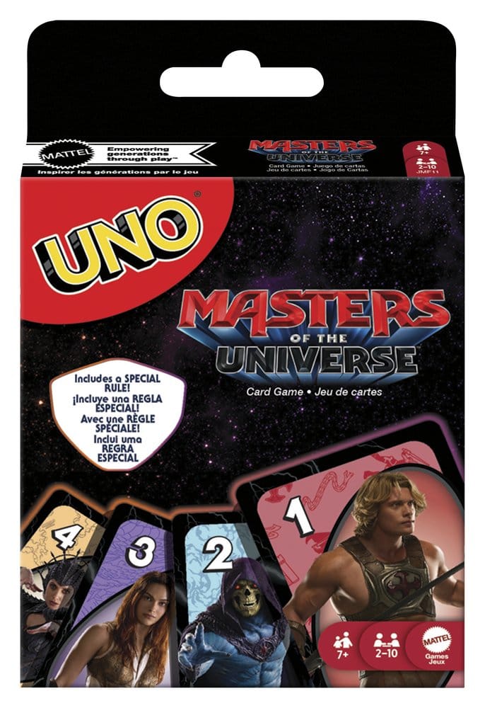 Fans des „Masters of the Universe“-Films werden die Macht spüren, wenn sie diese Sonderedition des Kartenspiels UNO spielen. Das Kartendeck zeigt heldenhafte Bilder von den Lieblingscharakteren aus Eternia. Die Spieler versuchen, passende Zahlen und Farben abzulegen. Es gibt sogar eine Sonderregel „Schwert der Macht“, wodurch die Spieler in ihrem Zug zwei Karten abwerfen dürfen. Und natürlich dürfen die Spieler nicht vergessen, laut „UNO!“ zu rufen, wenn sie nur noch eine Karte auf der Hand haben! Ein legendäres Geschenk für Fans von Masters of the Universe und Kartenspiel-Liebhaber ab 7 Jahren.