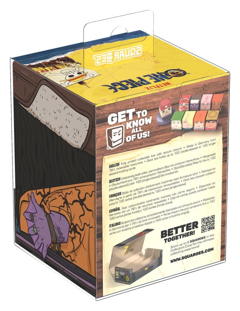 Vergesst nicht, eure ONE PIECE-Sammlung mit dem passenden „Wooden Chest“ Collectors Case zu vervollständigen – der perfekten Box zur Aufbewahrung von bis zu acht Squaroes!