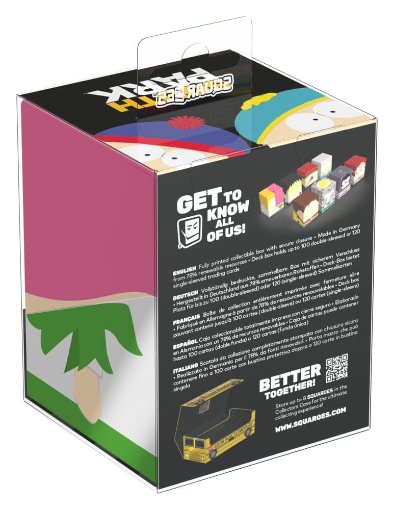 Sammelbare Box zur Aufbewahrung von TCG-Decks, Tabletop-Zubehör und/oder Sammlerstücken. Der Mintberry Crunch Squaroe aus der South Park™-Edition bietet als Deck-Box benutzt Platz für bis zu 100 Spielkarten in doppelter Schutzhülle. Squaroes werden aus 78% erneuerbaren Rohstoffen hergestellt und passen perfekt in das separat erhältliche Collectors Case.