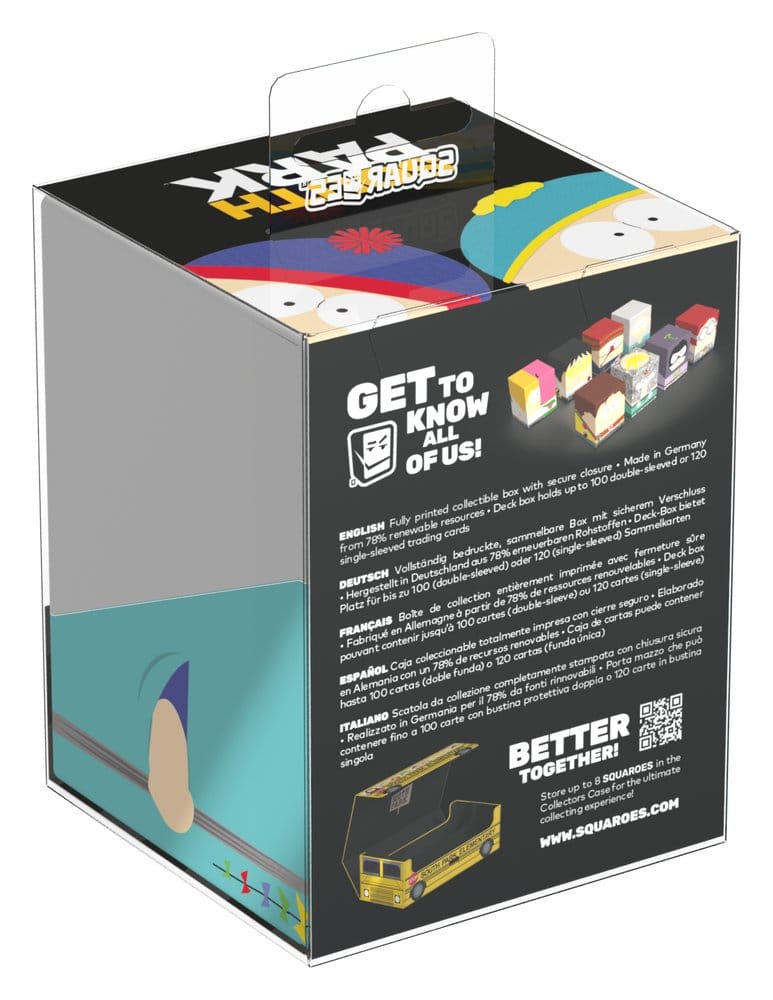 Sammelbare Box zur Aufbewahrung von TCG-Decks, Tabletop-Zubehör und/oder Sammlerstücken. Der Human Kite Squaroe aus der South Park™-Edition bietet als Deck-Box benutzt Platz für bis zu 100 Spielkarten in doppelter Schutzhülle. Squaroes werden aus 78% erneuerbaren Rohstoffen hergestellt und passen perfekt in das separat erhältliche Collectors Case.