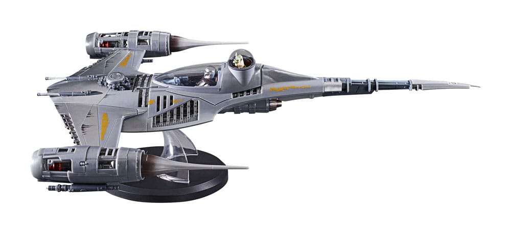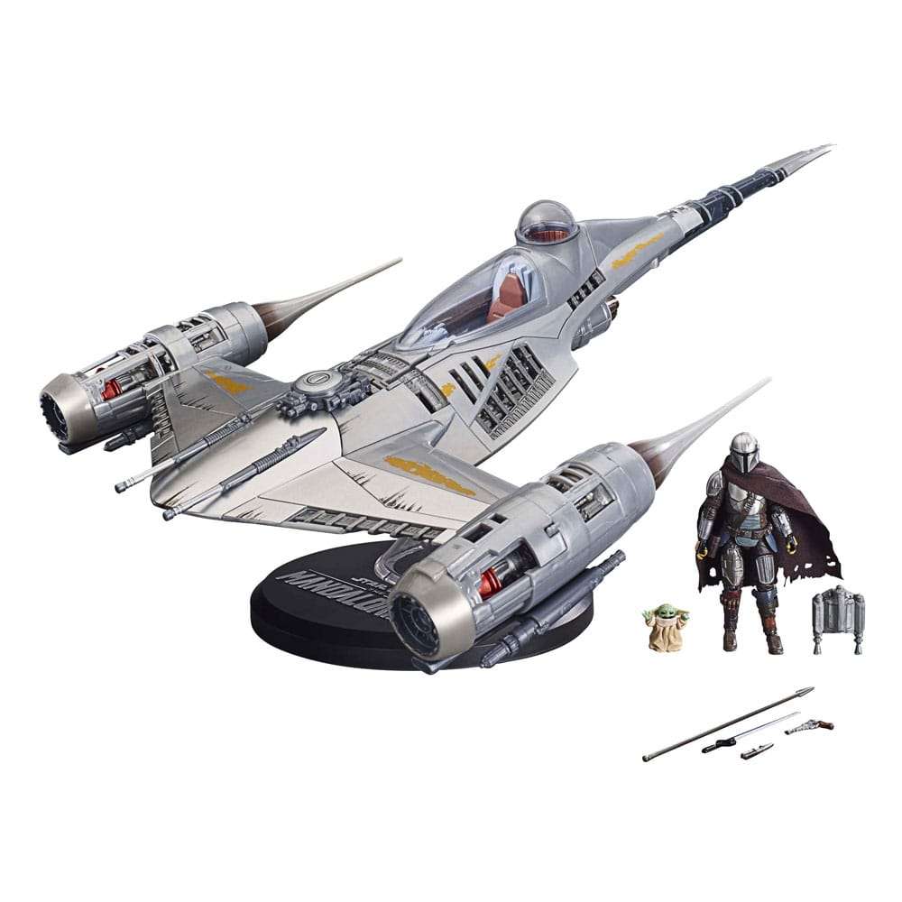 Enthält: Fahrzeug, Figur mit Grogu, Sockel, 2 Ständer und 5 Accessoires.