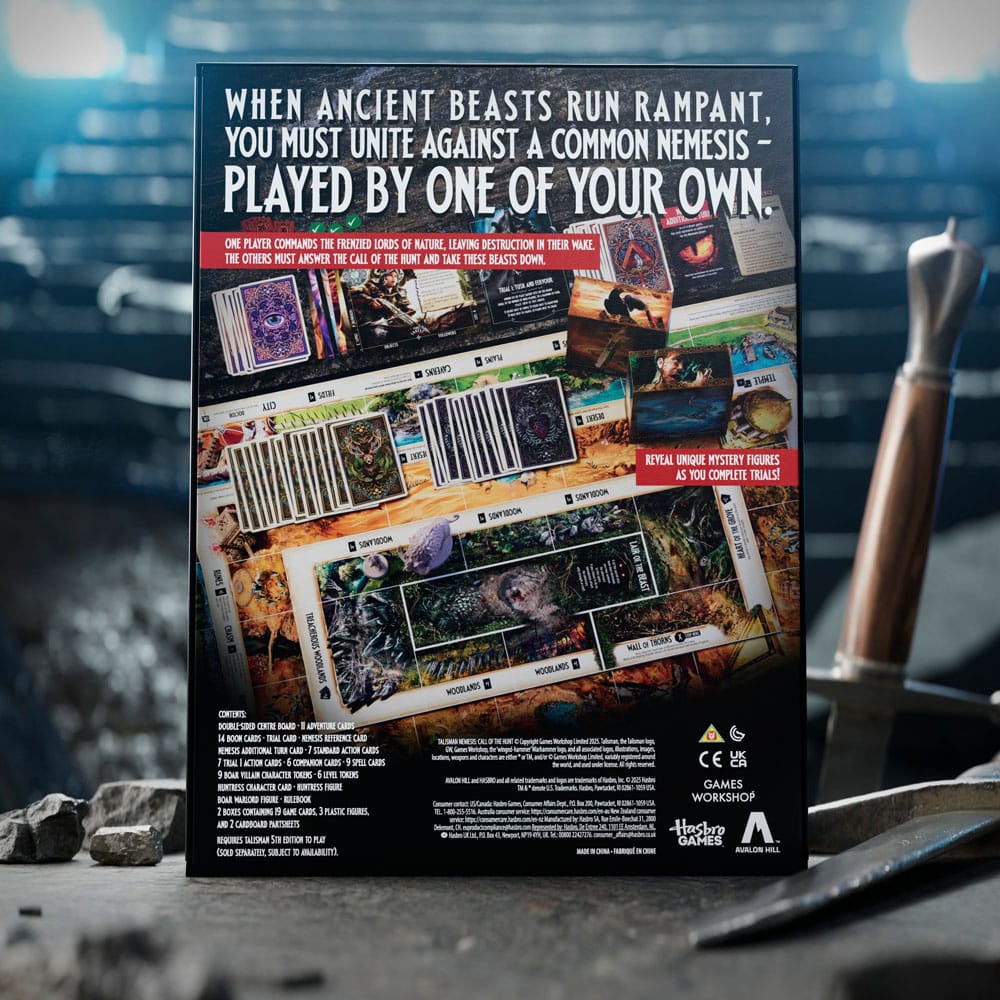 Die Nemesis kontrolliert jähzornige Bestien und hinterlässt eine Spur der Verwüstung. Es ist an den Helden, dem Ruf der Jagd zu folgen und diese Bestien zu erlegen. Bei der Avalon Hill „Talisman Nemesis: Ruf der Jagd“ Erweiterung tritt ein Spieler gegen alle anderen an. Hier arbeiten die Helden zusammen, um 3 gefährliche Prüfungen zu bestehen, und jede Prüfung wartet mit einem einzigartigen Widersacher und Bösewichten auf. Um zu gewinnen, müssen sie jeden Widersacher besiegen, bevor die Nemesis sie vernichtet. Das Ziel der Nemesis? Jede Prüfung bringt ein neues Ziel mit sich. Während sich die Spieler den Herausforderungen stellen, öffnen sie Schachteln und enthüllen geheime Karten und Figuren, die dem Spiel hinzugefügt werden. Mit diesem Tabletop-Abenteuerspiel kann ein fantastischer Spieleabend stattfinden. Es eignet sich für 3 bis 6 Spieler ab 12 Jahren. (Talisman 5. Edition erforderlich. Separat erhältlich. Je nach Verfügbarkeit.) Für noch mehr Abenteuer gibt es auch den Erweiterungspack Talisman Allianzen und das Basisspiel Talisman 5. Edition. (Jeweils separat erhältlich.)