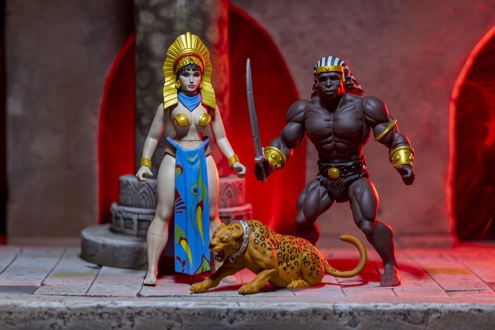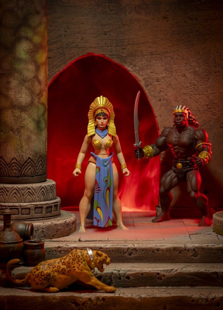 Dieses Museums-Editions-Figurenset erweckt Frank Frazettas ikonisches Gemälde zum Leben. Das Set enthält zwei 5,5-Zoll-Figuren: die Ägyptische Königin mit abnehmbarem Rock und Schal und den Wächter, der mit einem Schwert ausgestattet ist. Beide Figuren verfügen über mehrere Artikulationspunkte. Exklusiv in dieser Edition sind ein Jaguar-Zubehör, eine Treppe mit Säule und ein Papp-Hintergrund, alles präsentiert in einer Fenster-Displaybox.