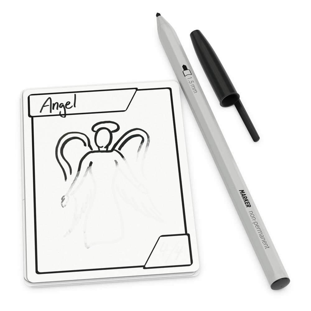 - Sleeven: Verwende einen wasserlösslichen Stift für widerstandsfähigere Zeichnungen oder um die Tokens zu sleeven. Zur Wiederverwendung einfach mit einem feuchten Handtuch oder ein paar Tropfen Reinigungsalkohol abwischen.