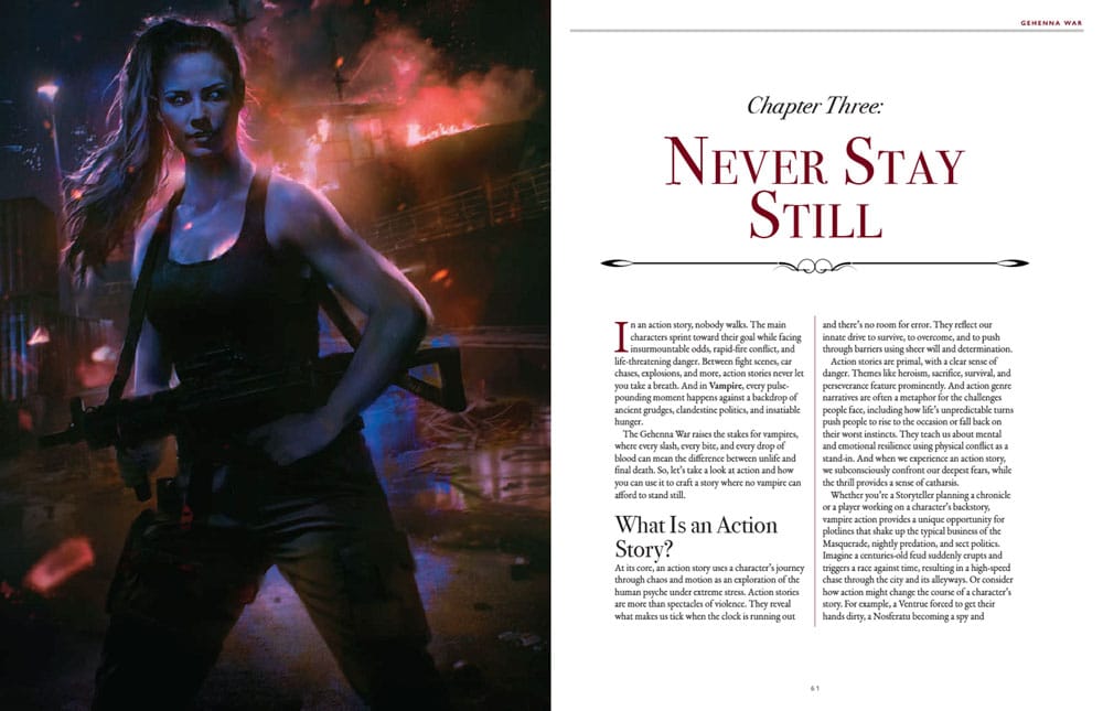 Gehenna War bietet sowohl Spielern als auch Geschichtenerzählern Material, um das Spiel zum Leben zu erwecken, wobei der Schwerpunkt auf rasanten Actionsequenzen und deren Einbindung in Geschichten und Chroniken liegt.