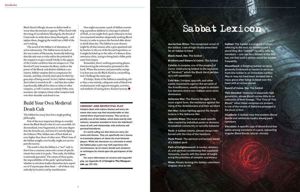 Sabbat: Die Schwarze Hand ist eine Ergänzung zum Rollenspiel Vampire: The Masquerade, die detailliert die Geschichte und den Hintergrund des Sabbats beschreibt, einschließlich neuer Pfade und Disziplinen, Geschichten und neuer Ressourcen für den Spielleiter für ein reichhaltigeres Rollenspielerlebnis.